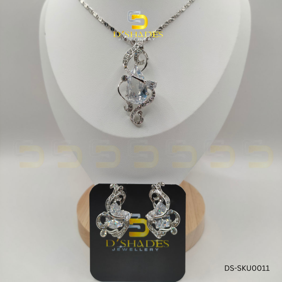 Diamond Loop Pendant Set is a timeless blend of elegance and sophistication. This exquisite Zircon set is adorned with Korean Diamond stones, offering a radiant sparkle and luxurious appeal. The beautifully crafted pendant, paired with matching earrings, adds a touch of grace and charm to any outfit, making it a perfect choice for both formal and casual occasions.