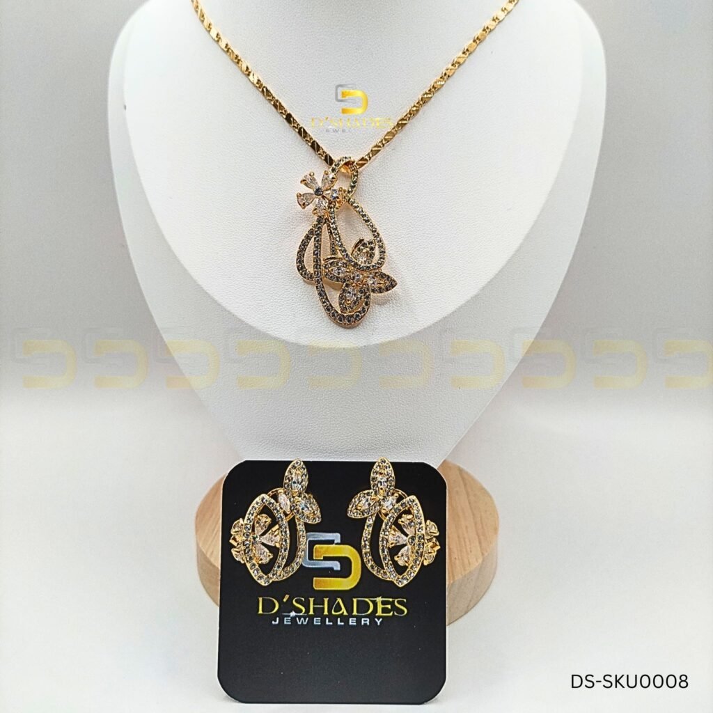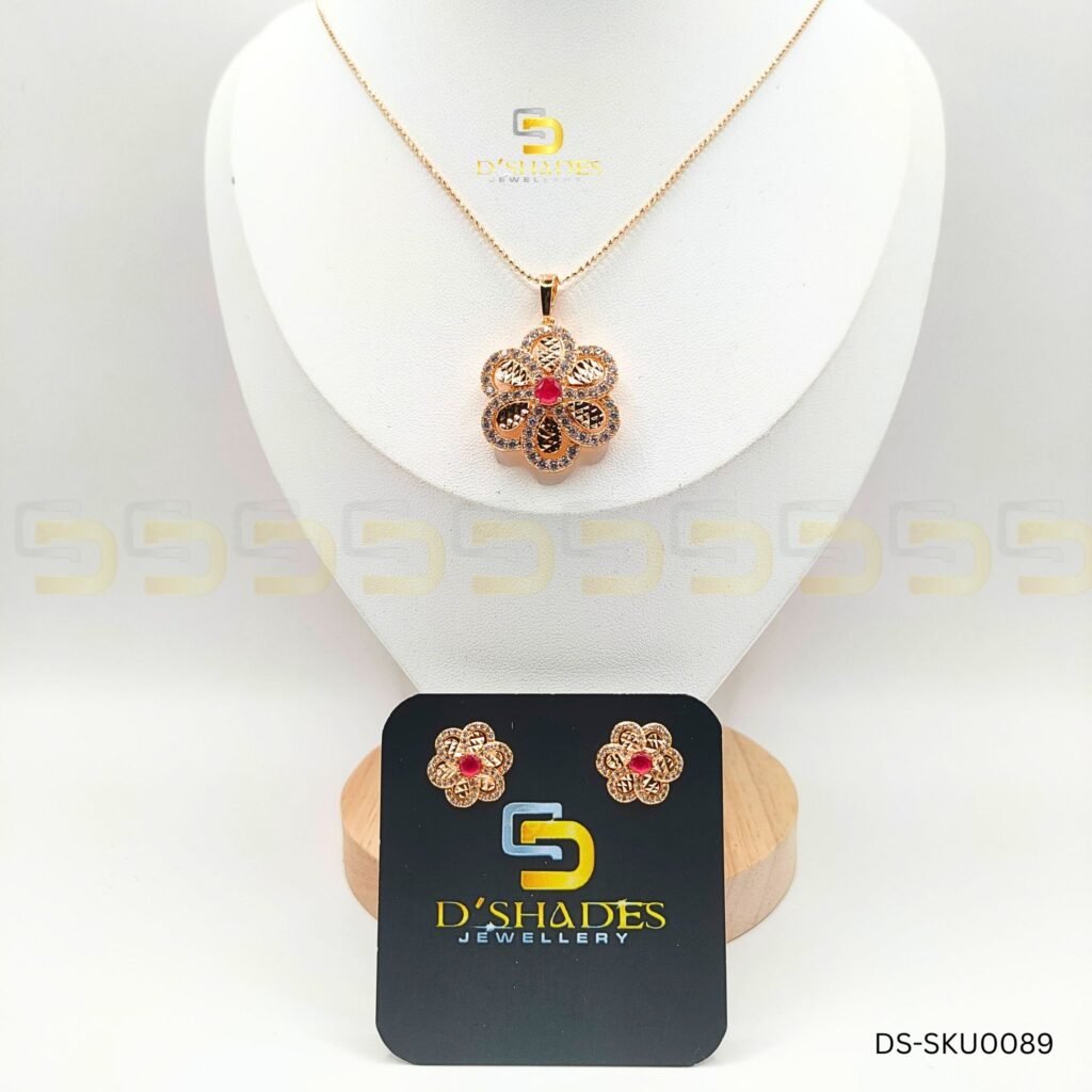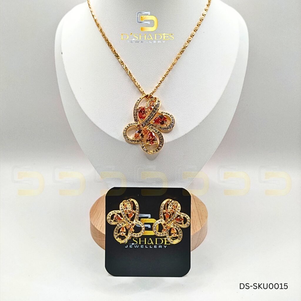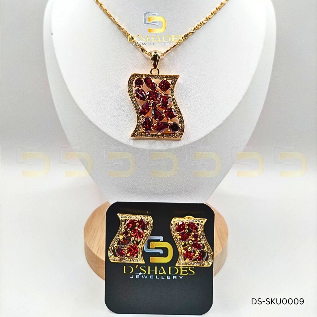 Golden Ruby Pendant Set is a timeless blend of elegance and sophistication. This exquisite Zircon set is adorned with Korean Diamond stones, offering a radiant sparkle and luxurious appeal. The beautifully crafted pendant, paired with matching earrings, adds a touch of grace and charm to any outfit, making it a perfect choice for both formal and casual occasions.