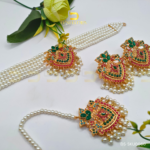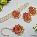 Turn heads with the royal charm of the Heer Baandhan Choker Set – a breathtaking fusion of tradition and elegance. This set features a five-strand pearl choker adorned with a bold centerpiece, embellished in rich ruby-red stones and finished with delicate pearl drops. The matching earrings and maang tikka echo the grandeur, making it a perfect pick for brides, bridesmaids, or festive occasions.