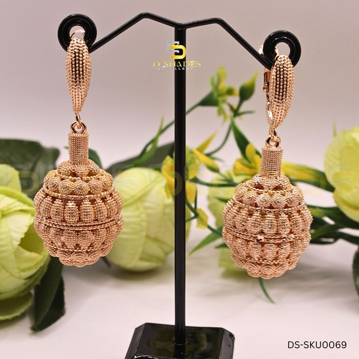 “Add a touch of timeless elegance with our Rose Gota Jhumkis — intricately crafted in a rich gold finish with delicate textures that exude festive charm and traditional flair.”